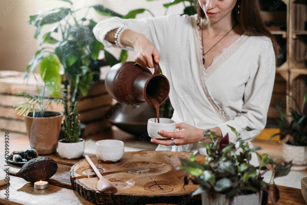 Cacao ceremony in atmospheric space with green plants and candles. Woman making ritual healthy drink from cocoa beans. Person pouring fresh made hot chocolate drink into jar