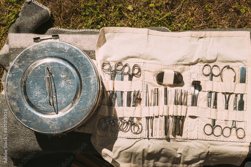 Old Medical And Surgical Instruments. Many Surgical Instruments For Surgery. Old Different Metal Medical Instruments Objects. Retro Stainless Surgical Equipment Tools