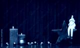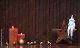Weihnachtshintergrund: Arrangement mit Kerzen, Stern, Nikolaus und Weihnachtskugeln .