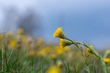 Majowa łąka pokryta kwiatami podbiału pospolitego.