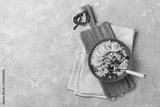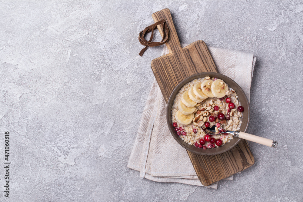 Healthy breakfast with oatmeal, berry, nuts and banana