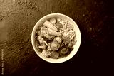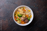 Traditional dish of Asian cuisine: noodles with shiitake mushrooms and vegetables
