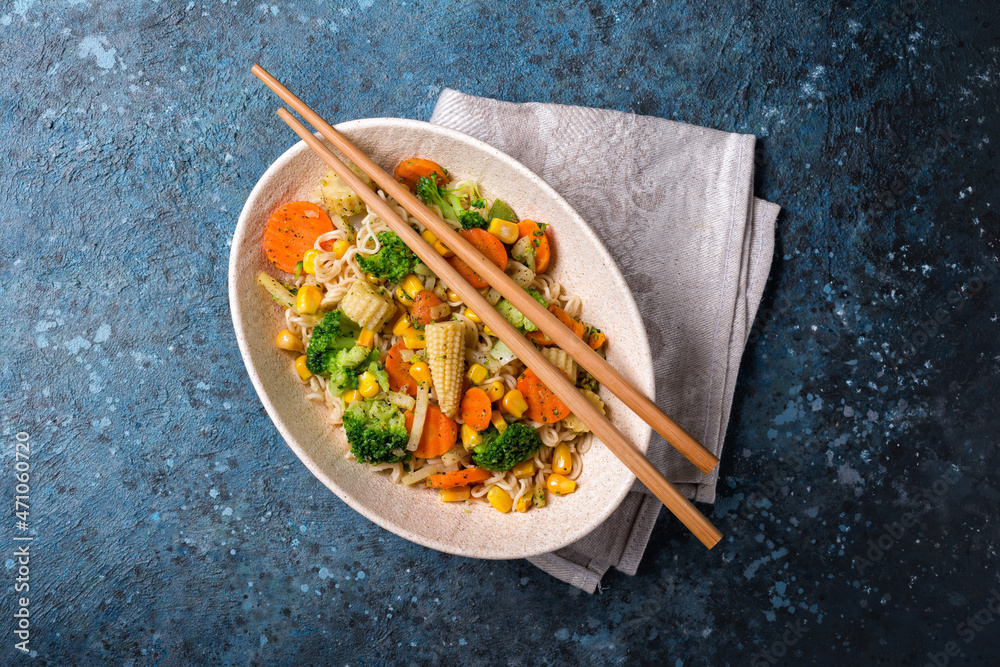 Traditional dish of Asian cuisine: noodles with vegetables