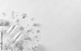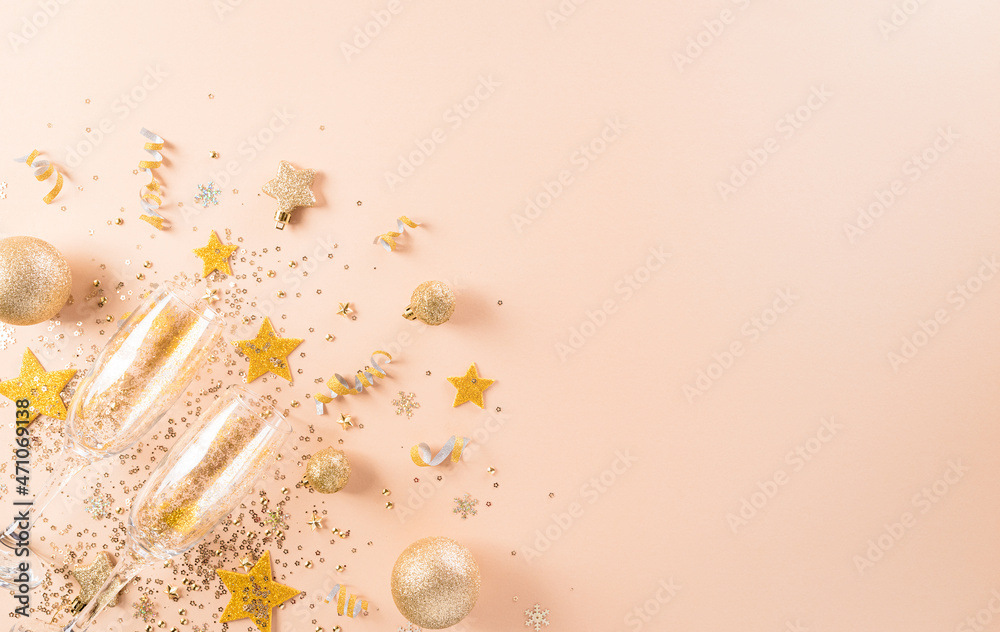 Happy New year celebration background concept. Golden gift box, stars, christmas ball and champagne on pastel background.