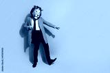 Full length photo of excited lion character guy dance theme festive event empty space isolated over blue color background
