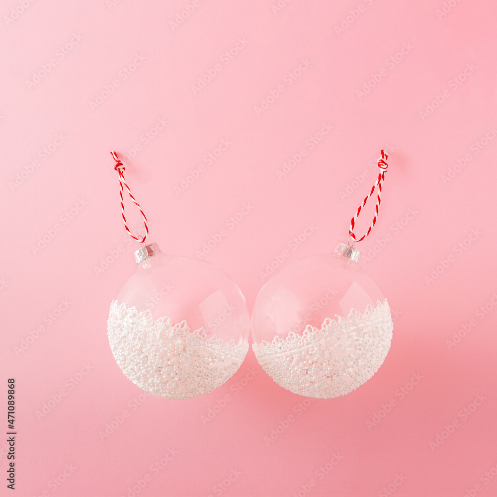 Lace and glass Christmas baubles concept against pink background.Surreal minimal winter holidays decoration. Creative New Year ornaments arrangement.