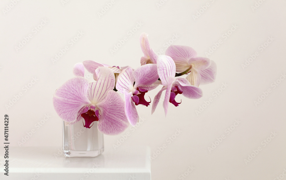 Pink phalaenopsis orchid flower in white bowl on beige interior. Selective soft focus. Minimalist still life. Light and shadow nature horizontal long background.