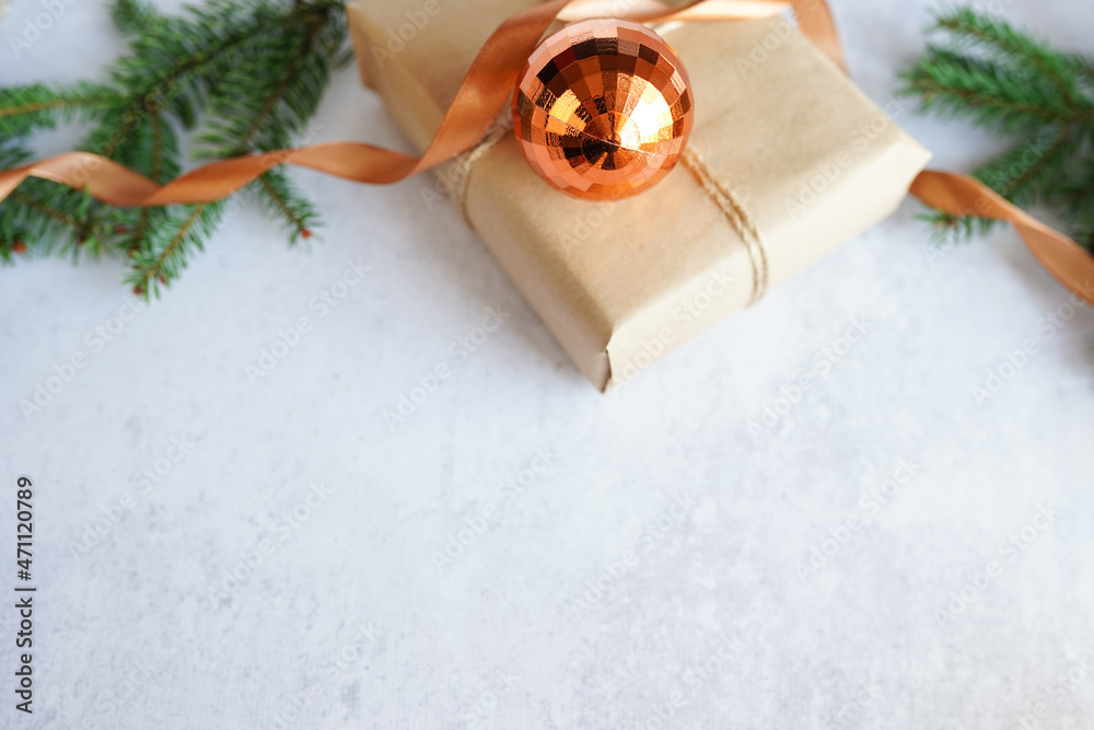 Christmas card with paper gift box and Christmas decorations on a white background