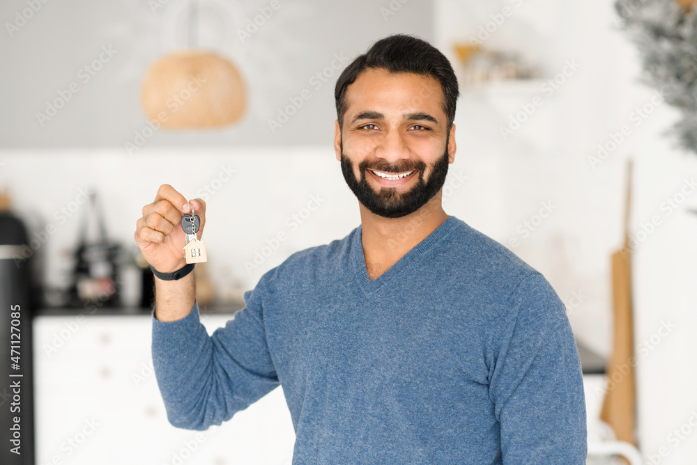 The keys in hand of happy bearded Indian man, cheerful male moved in new house, rent apartment, cheerful ethnic guy bought own real estate, the key with keyring in shape of little house