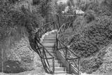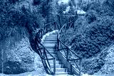Beautiful nature landscape view of old outdoor stairs path through green plants. Greece.