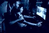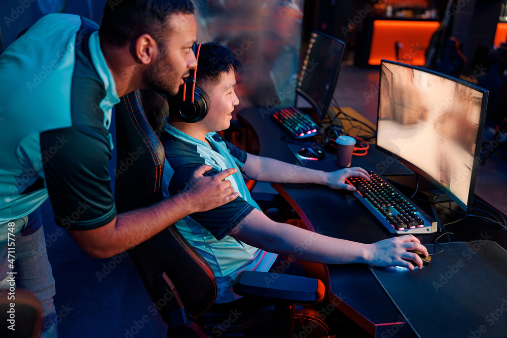 Happy esports player concentrated on game wearing wired headset while friend assisting him to pass network game in internet club