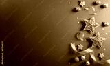 Christmas and new year background concept. Top view of Christmas decoration made from snowflake, christmas ball and star on red background.