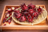 Roselle fruits in bamboo basket on wooden background, Hibiscus Sabdariffa or roselle fruits on wooden table.