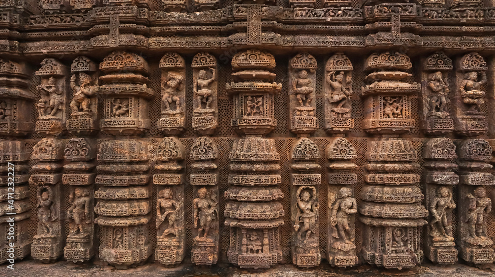 Carvings of musicians and dancers that almost completely cover the platform, walls and pillars of the hall on Bhoga Mandapa or the dance hall, Sun Temple, Konark, India.