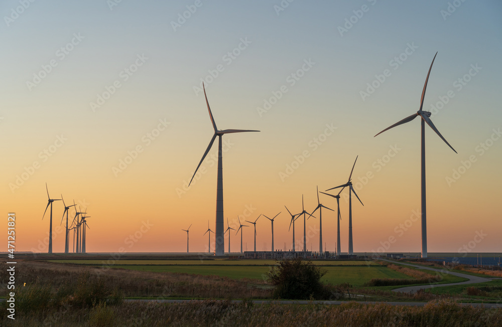 Wind turbines spinning in the countryside during dusk.