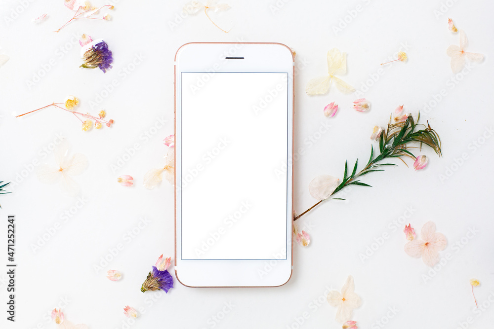 Mock up. Smart phone on dried flowers in epoxy resin. Top view, flat lay, copy space. Mobile app