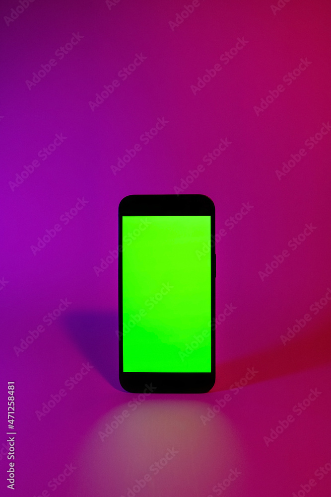 Mobile phone with green screen, smartphone mock up. Neon illumination. Pink and purple color. Flat screen modern smartphone
