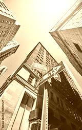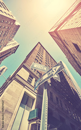 Looking up at One Way road signs in Manhattan, color toning applied, New York City, USA.