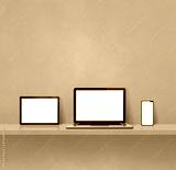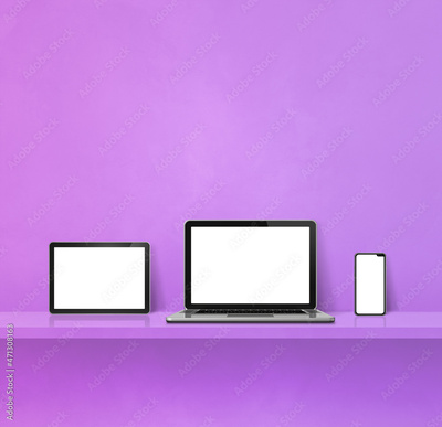 Laptop, mobile phone and digital tablet pc on purple wall shelf. Square background