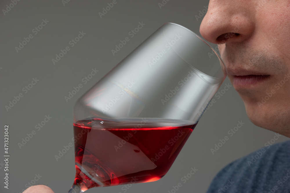 Rosé wine in glass being sniffed by unrecognizable Caucasian male. Close up studio shot, isolated on gray background