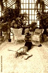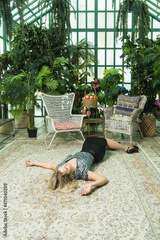 Strangled beautiful woman in a greenhouse. Simulation of the crime scene.....