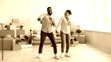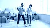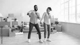 Satisfied young african american husband and wife dancing in new apartment with cardboard boxes