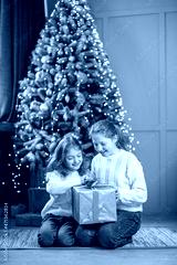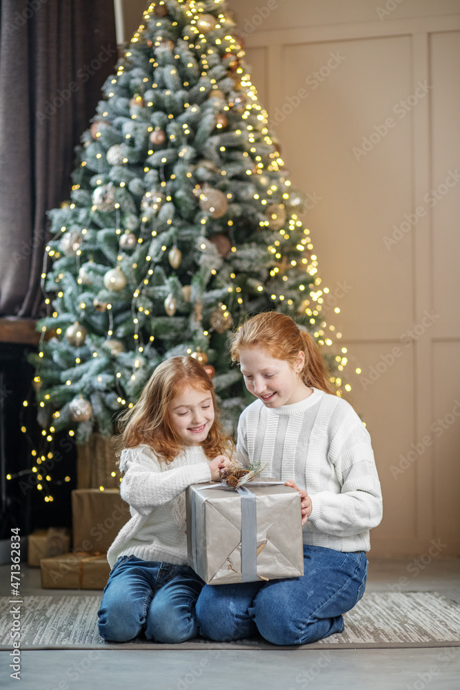 Two little sisters open gift boxes under the tree in the room. Winter holidays concept, merry christmas and family