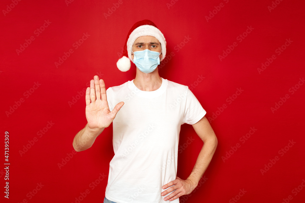 concept Christmas lockdown, fight against covid-19 coronavirus, health. serious man in medical mask New Year cap shows stop sign with his hand outstretched in front of him posing on studio background