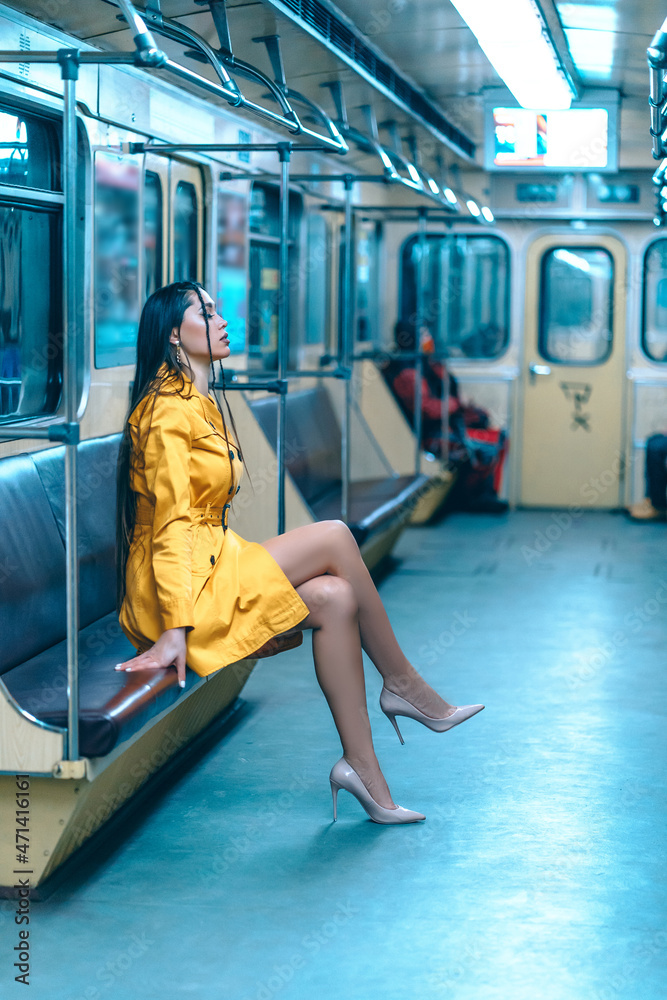 Charming Lady in a Cute Sexy Yellow Dress with Delightful Slender Legs Sitting Inside the Empty Underground Train. Full Size Profile of Nice Woman in Yellow Coat in the Train. Close-up