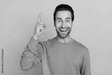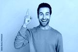 Photo of beard cool guy index up wear blue pullover isolated on pastel pink color background