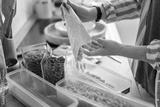 Top view female housewife placing sorting different kinds of vegan pasta into pp boxes