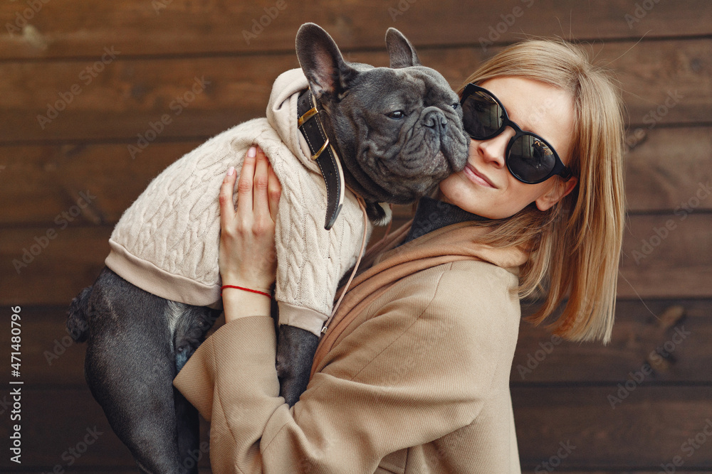 Elegant woman in a brown coat with black bulldog