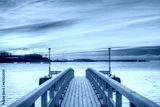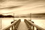 Old Frosted Wooden Boards Pier On Calm Water Of Lake Or River Or Sea At Evening Or Morning Time. Sunset Sunrise In Winter Season