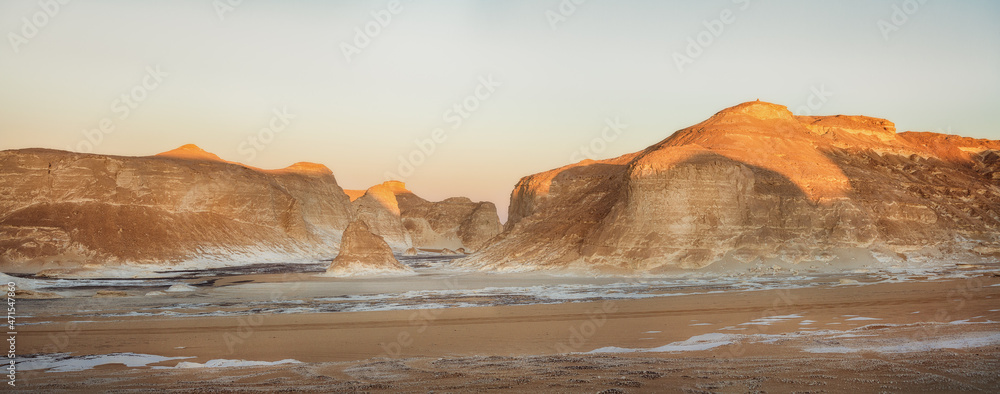Whimsical sandstone formations in the white desert at sunrise. Egypt. Panorama Black and white desert.