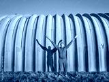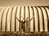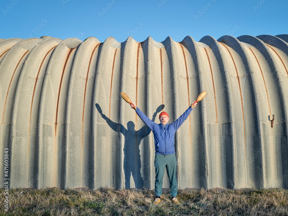 senior athletic male is exercising with wooden Indian clubs with a company of a shadow on a grunge metal hangar, workout in urban or industrial environment