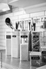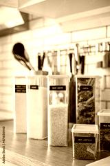 Closeup transparent case box with title names for comfortable keeping food tidying up at kitchen