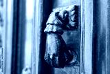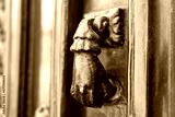 Kołatka w kształcie ręki, stara, ozdobna montowana na drzwiach.