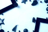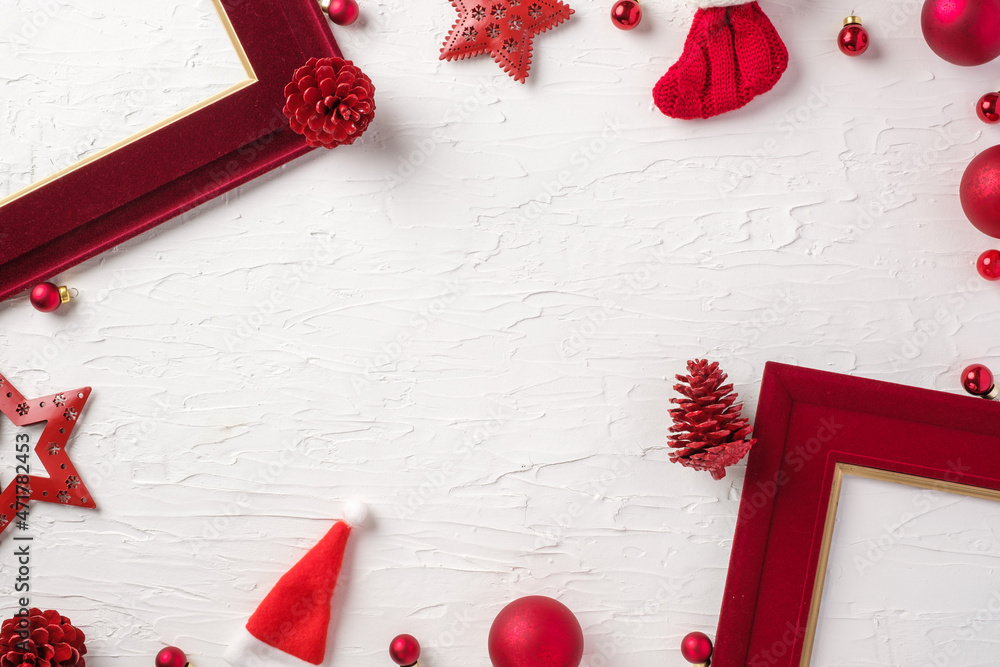 Christmas red picture frame and bauble decoration ornament on white concrete table background