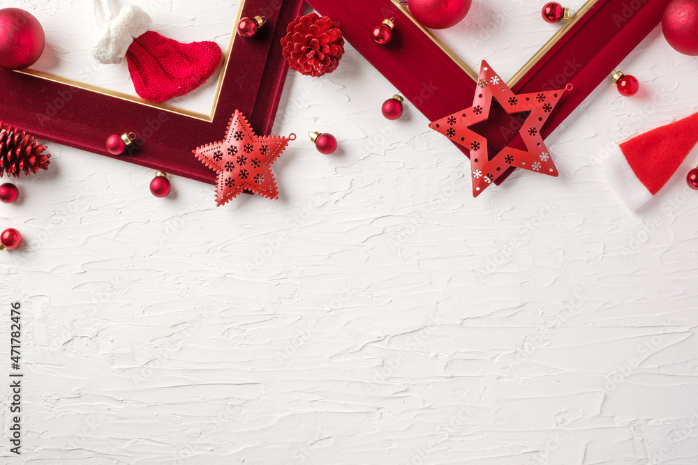 Christmas red picture frame and bauble decoration ornament on white concrete table background