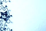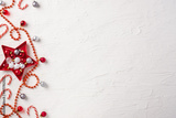 Christmas ball and tinsel and star decoration ornament on white concrete table background