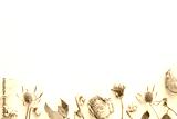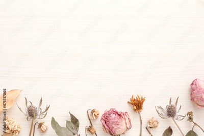 俯瞰のピンクのバラなどのドライフラワーのフレームと淡い木目の背景とコピースペース