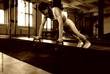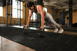 Slim sporty woman doing push-ups in a gym. Crossfit training.