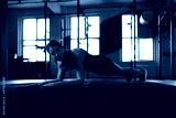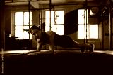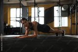 Portrait of a muscular woman on a plank position.