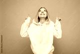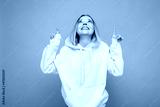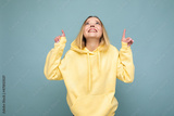 Portrait of young beautiful smiling hipster blonde woman in trendy yellow hoodie. Sexy carefree female person posing isolated near blue wall in studio. Positive model with natural makeup. Copy space