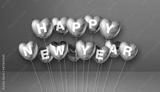 Gold happy new year heart shape balloons on orange concrete background. Horizontal banner