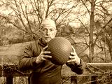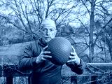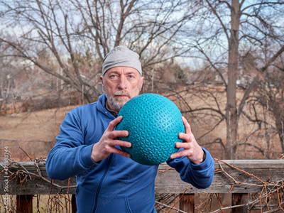 senior male (late 60s) is exercising with a heavy slam or medicine ball in his backyard, chilly afternoon in fall scenery