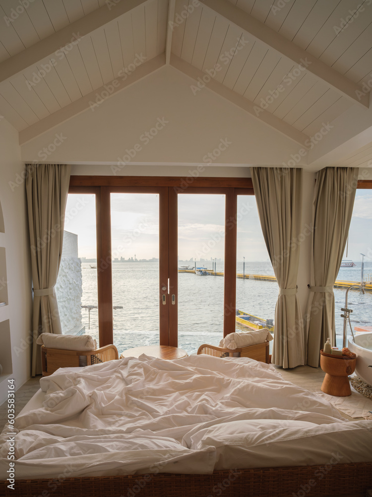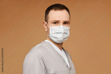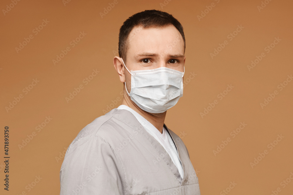 Young man nurse hospital worker in a medical protective mask isolated on a beige background with copy space