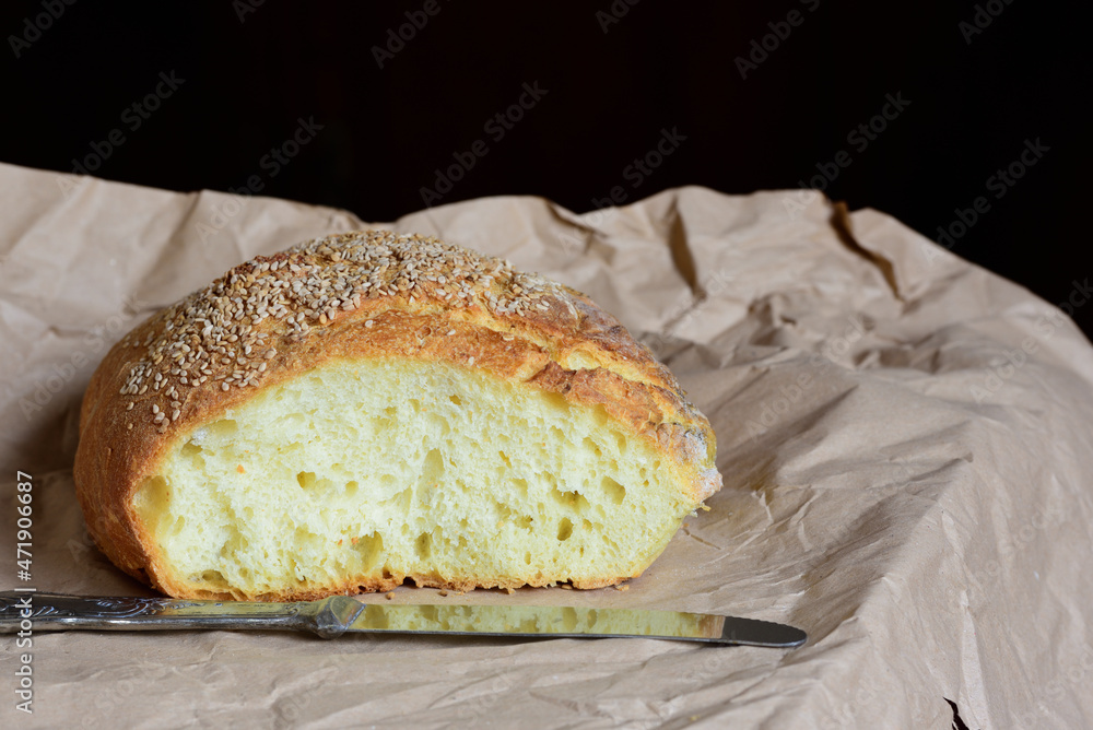 Close up of a sliced white bread with sesame seeds on a piece of paper against a dark background