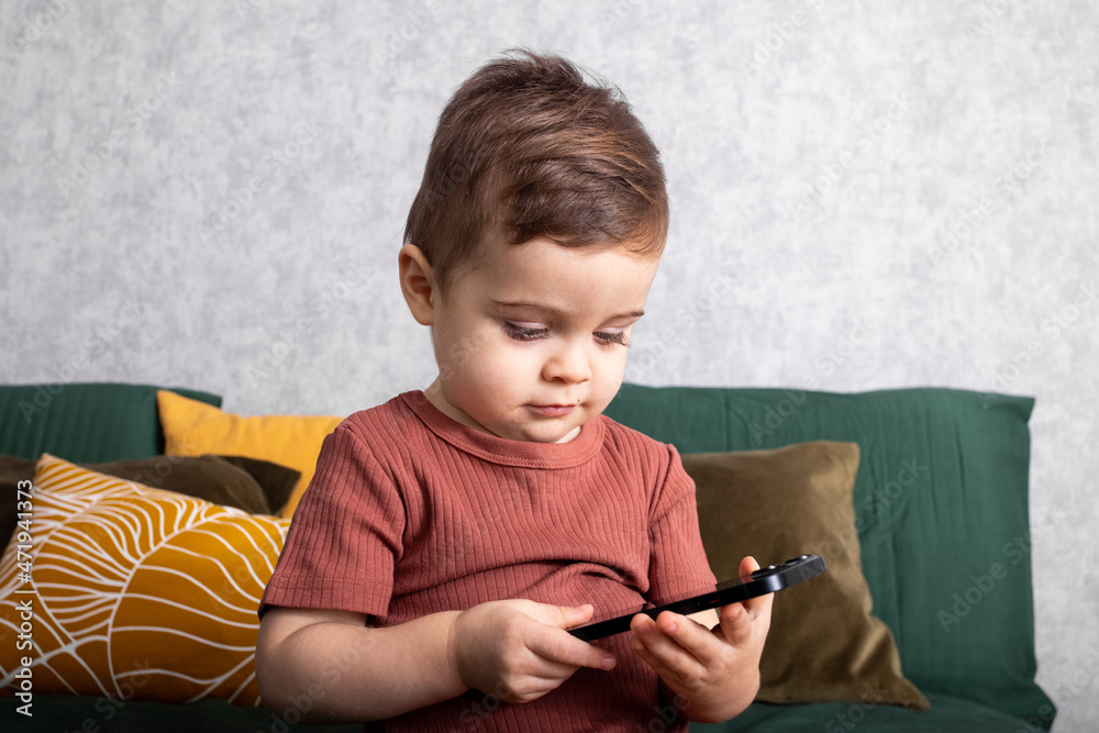 A child is playing on a mobile phone on the bed at home.Portrait of a toddler boy