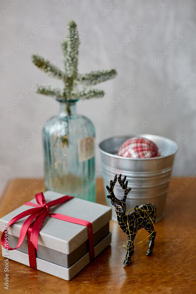 Small Christmas tree and festive gift box on the vintage wooden table in the living room interior